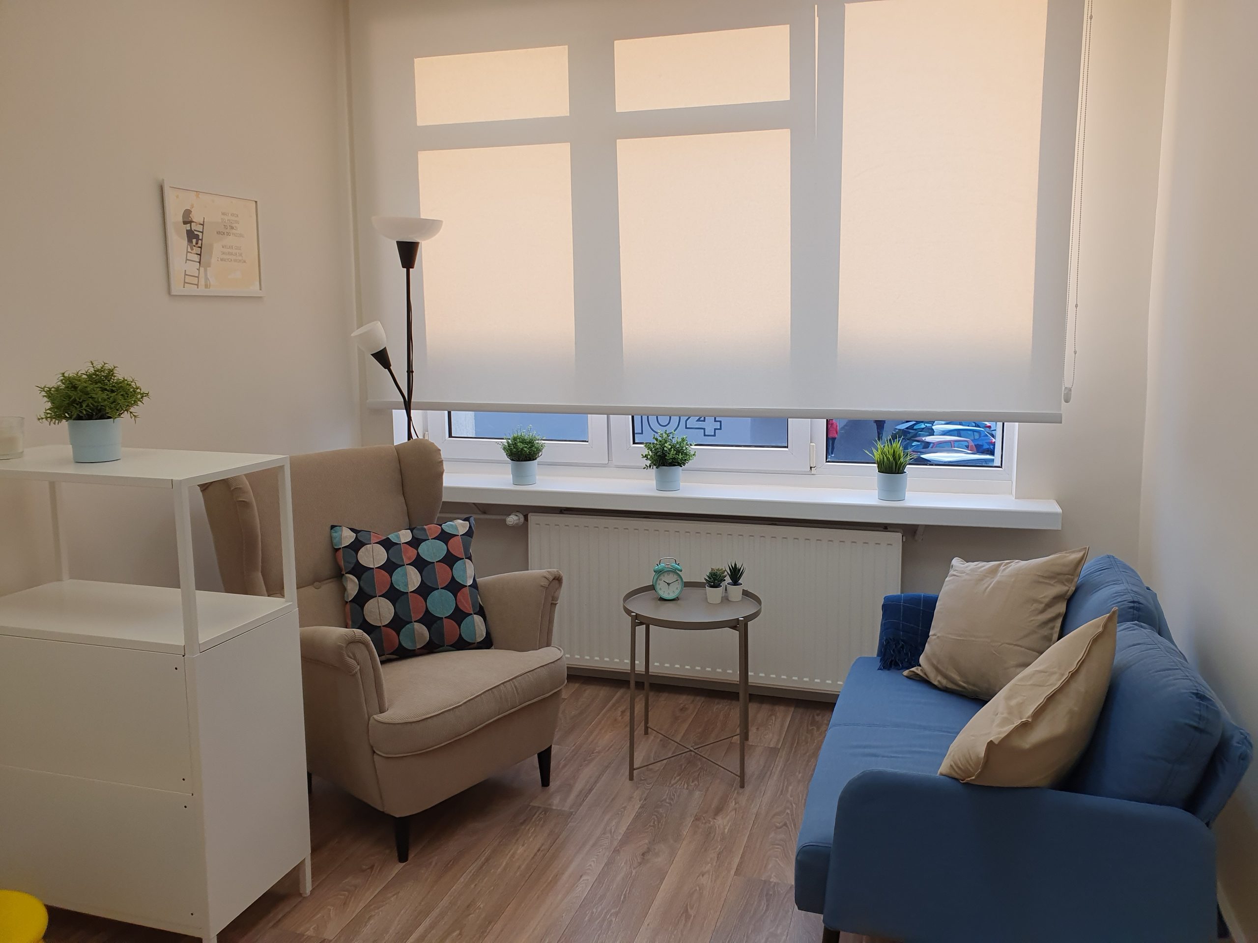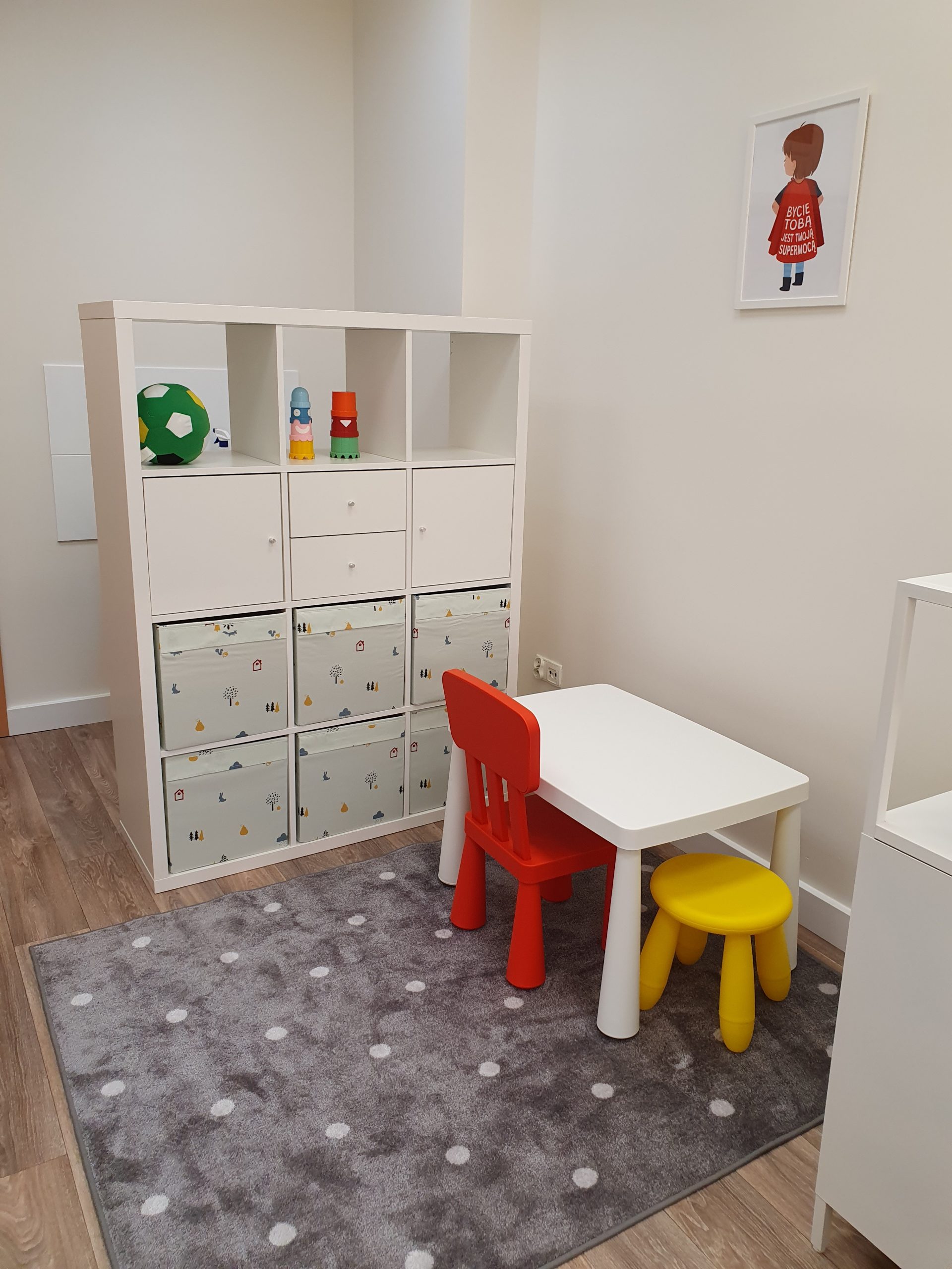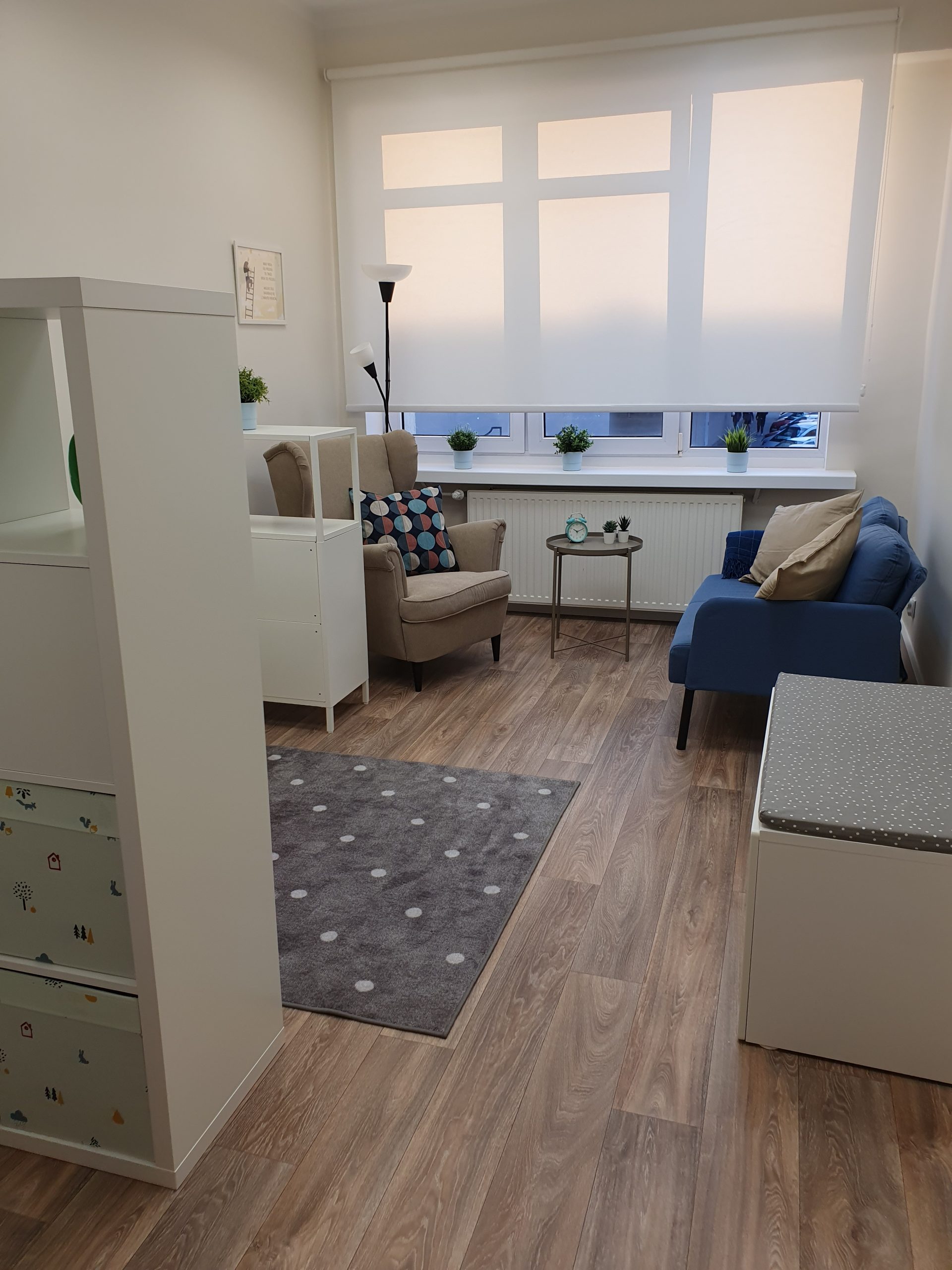 Aby odpowiedzieć na potrzeby dzieci i ich rodziców/opiekunów pomieszczenie gabinetu zostało podzielone na dwie strefy: konsultacyjną i terapeutyczną. Gabinet stwarza bezpieczną i przyjazną przestrzeń tak, aby wszyscy korzystający z moich usług mieli poczucie komfortu i intymności.